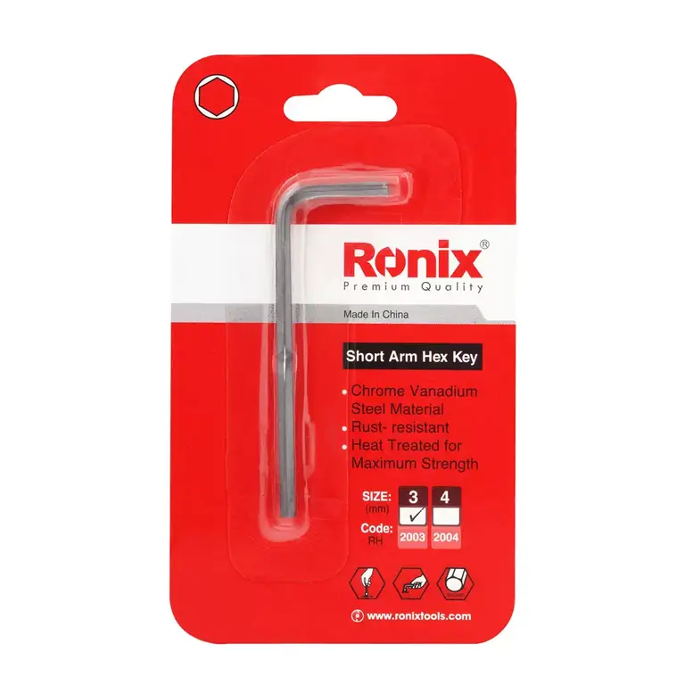آلن تک کوتاه رونیکس مدل RH-2003، با طراحی L شکل و مقطع ششضلعی، برای شل و سفتکردن انواع پیچهای آلن مناسب است. از هر دو سر این آچار میتوان استفاده کرد. این محصول به ابعاد 3 میلیمتر و از جنس فولاد کروم وانادیوم ساخته شده که موجب حداکثر استحکام ابزار میشود. همچنین سطح این آلن برای محافظت در برابر خوردگی با استفاده از اکسید سیاه پوشش داده شده است.