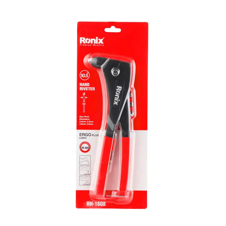 انبر پرچ RH-1608 رونیکس سیستم پرچ متمایزی دارد که موجب پرچ سریع‌تر قطعات می‌شود. این انبر بدنه‌ای از جنس آلیاژ آلومینیوم و فولاد دارد و ابزاری حرفه‌ای است که می‌تواند از هر سه نوع پرچ آلومینیومی، فولادی و استیل استفاده کند.