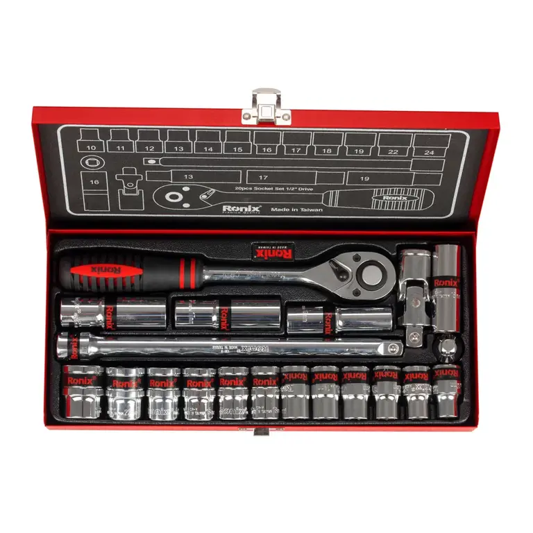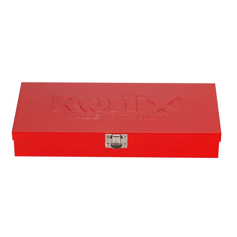 جعبه بکس RH-2620 رونیکس مجموعه ای شامل بکس های ½ اینچی در سایزهای 10، 11، 12، 13، 14، 15، 16، 17، 18، 19، 22 و 24 میلی متر، یک بکس شمع، یک دسته کمکی، یک دسته جغجغه، یک تبدیل ½ به 8/3 و یک لقلقه ½ اینچی است که از کروم وانادیوم سخت کاری شده ساخته شده و با روکشی از کروم شفاف آینه ای پوشیده شده است.