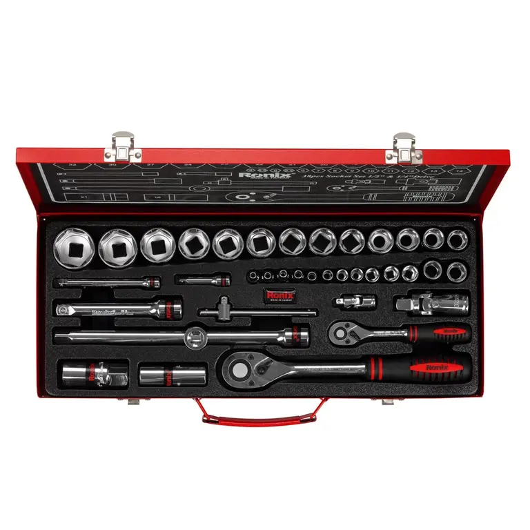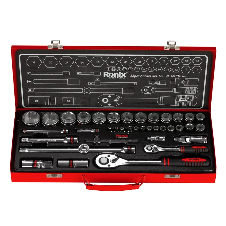 جعبه بکس RH-2638 رونیکس شامل 38 قطعه مختلف 1/2 اینچی و 1/4 اینچی است که همگی از جنس آلیاژ فولاد کروم-وانادیوم حرارت دیده به روش فورج ساخته شده و پولیش شده اند و دارای روکش شفاف آیینه ای هستند.