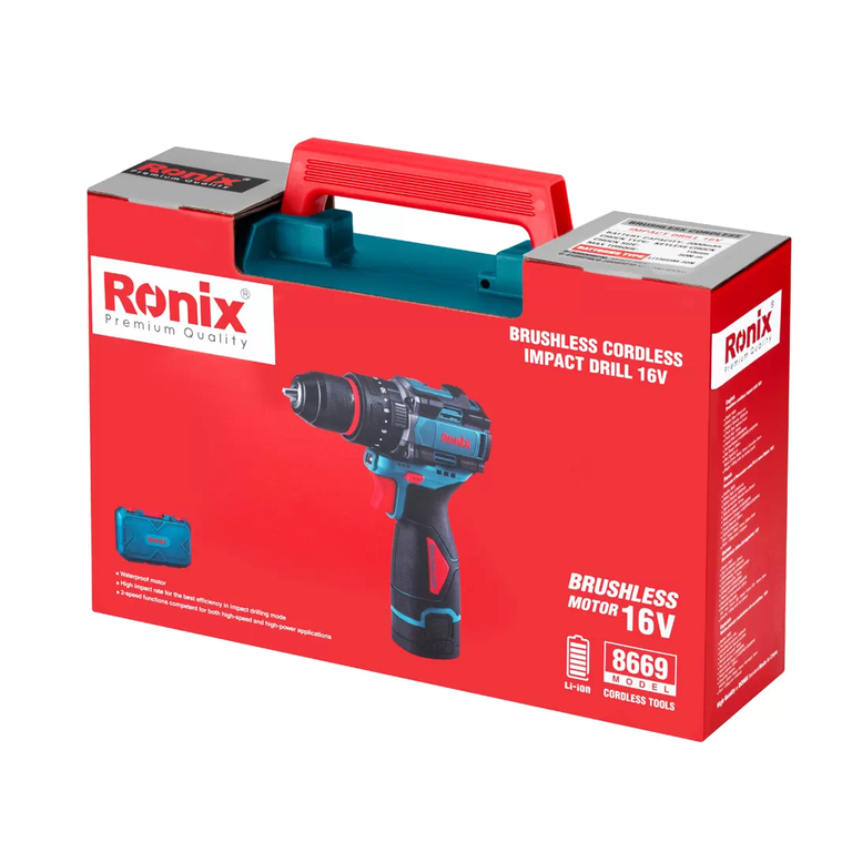 از آنجا که دریل چکشی شارژی رونیکس مدل 8669 رونیکس مجهز به موتور براشلس است و میان اجزا و قطعات آن در هنگام کار اصطکاک کمتری صورت میگیرد؛ در نتیجه، دستگاه داغ نمیشود و طول عمر ابزار و باتری را افزایش پیدا میکند. این ابزار شارژی رونیکس دارای سه قابلیت مکانیزم مجزای دریل، پیچگوشتی و چکشی است. باتری لیتیوم یون 16 ولتی، سهنظام اتوماتیک ایمن، قابلیت چرخش مته، سوئیچ گشتاور، نشانگر طول عمر باتری و چراغ الایدی از دیگر ویژگیهای این دریل چکشی رونیکس به شمار میروند.