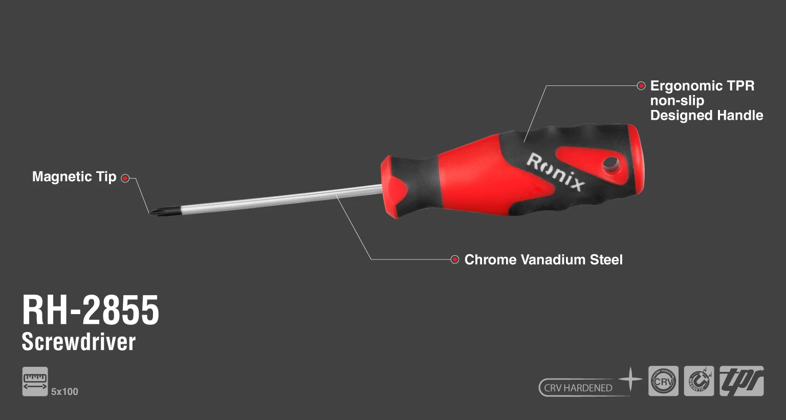 طراحی این پیچ گوشتی به گونه ای است که در استفاده های طولانی مدت کاربری راحتی را برای افراد فراهم می کند. همچنین دسته ضد لغزش آن با برخورداری از روکش TPR کنترل و دقت بالایی را در حین کار به وجود می آورد. از دیگر مشخصات مدل RH-2855 رونیکس پوشش اکسید سیاه در قسمت نوک این ابزار است که باعث حافظت نوک پیچ گوشتی در برابر خوردگی و زنگ زدگی شده و طول عمر بالای آن را تضمین می کند.