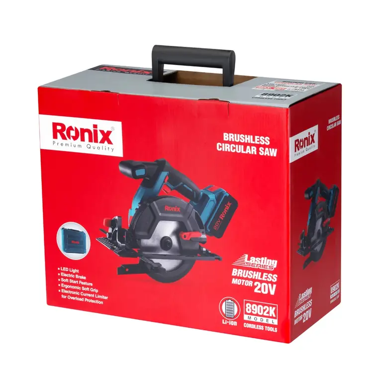 کیت اره گردبر شارژی 8902K رونیکس، به یک موتور براشلس DC 20 ولتی مجهز شده که سرعتی بالغ بر 5000 دور بر دقیقه دارد. این موتور، صفحه برش 165 میلیمتری اره را تا عمق 57 میلیمتر در زاویه صفر درجه و 41 میلیمتر در زاویه 45 درجه حرکت میدهد. همچنین، این دستگاه با باتریهای سری 89 رونیکس سازگار است.